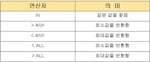 이때 WHERE 절 서브쿼리의 경우 서브쿼리 결과로 반환되는 행의 개수에 따라